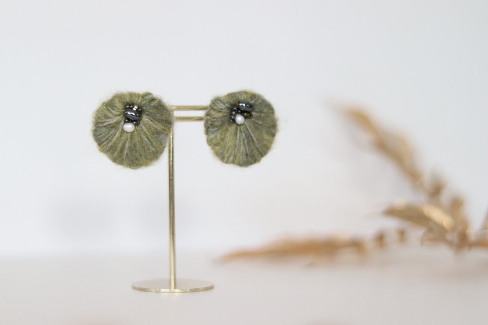 グレー✖️イエローのmixカラーのモヘアに、淡水パール、ヘマタイト等のビーズを施しました。