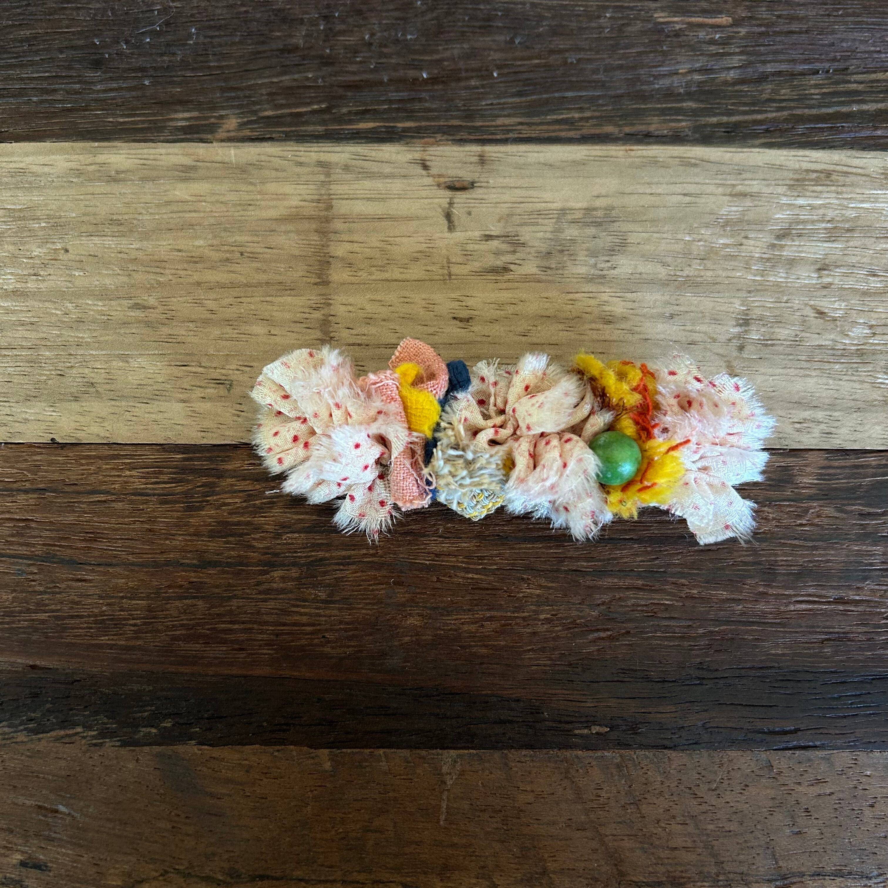 赤いピンドットが可愛い、しぼり生地をメインに使った髪飾りです。